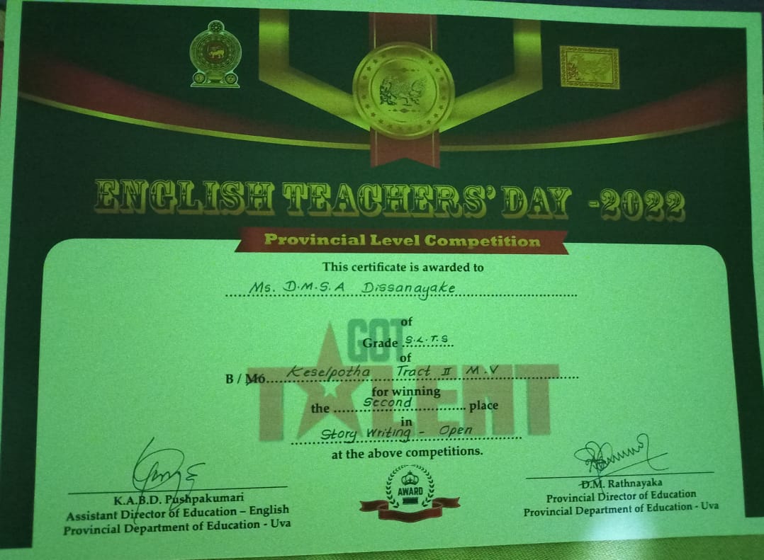 07 Dec2022 Teacher's Day Competition 2022 "Teacher's Day Competition 2022" තරගාවලිය සඳහා සහභාගි වී කෙටිකථා රචනා අංශයෙන් පළාත් මට්ටමේ දෙවන ස්ථානය ලබා ගැනීමට අප විද්යාලයේ ඉංග්රීසි විෂය උගන්වන ඩි.එම්. සජිනි අප්සරා ගුරුතුමිය සමත් විය.